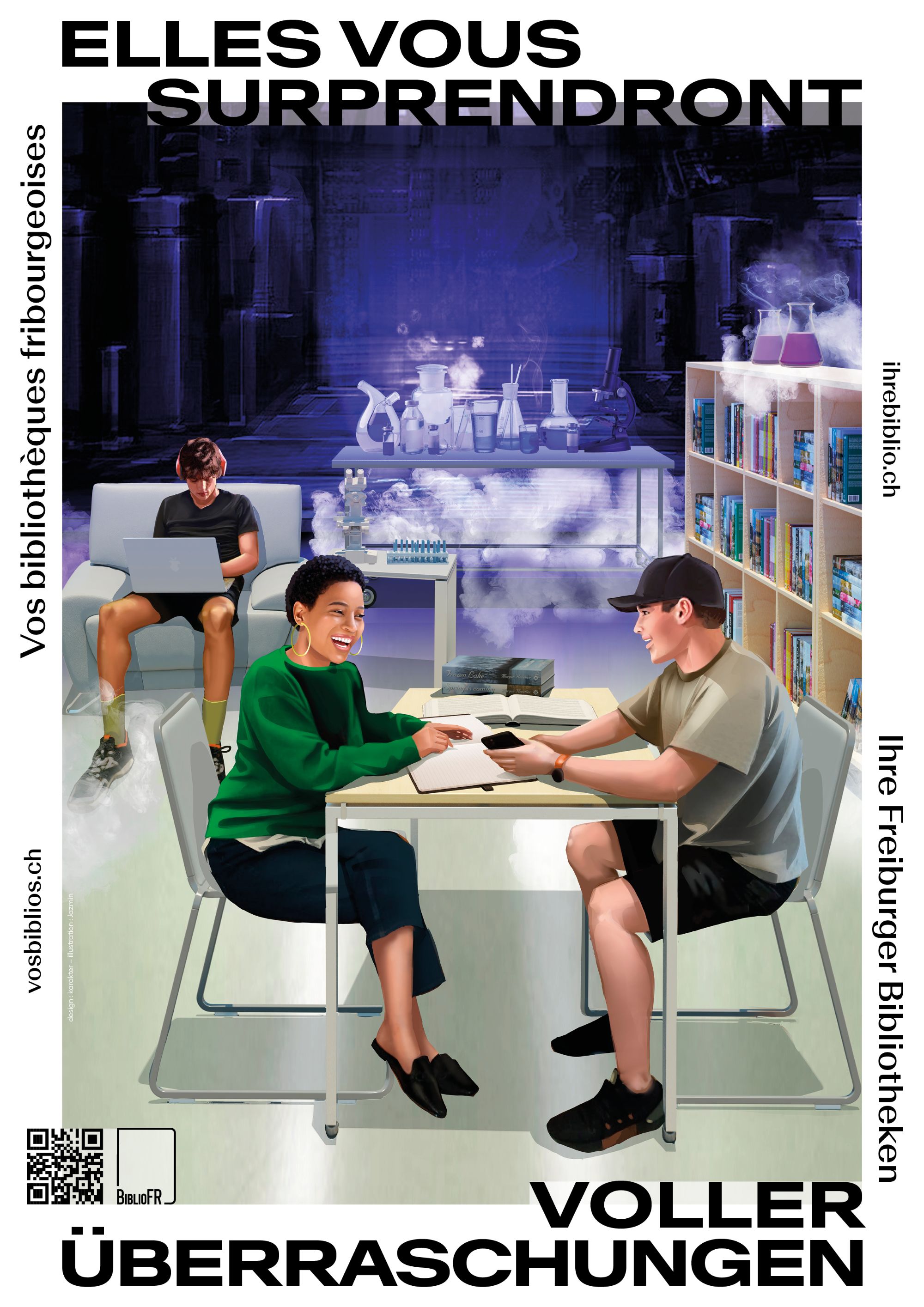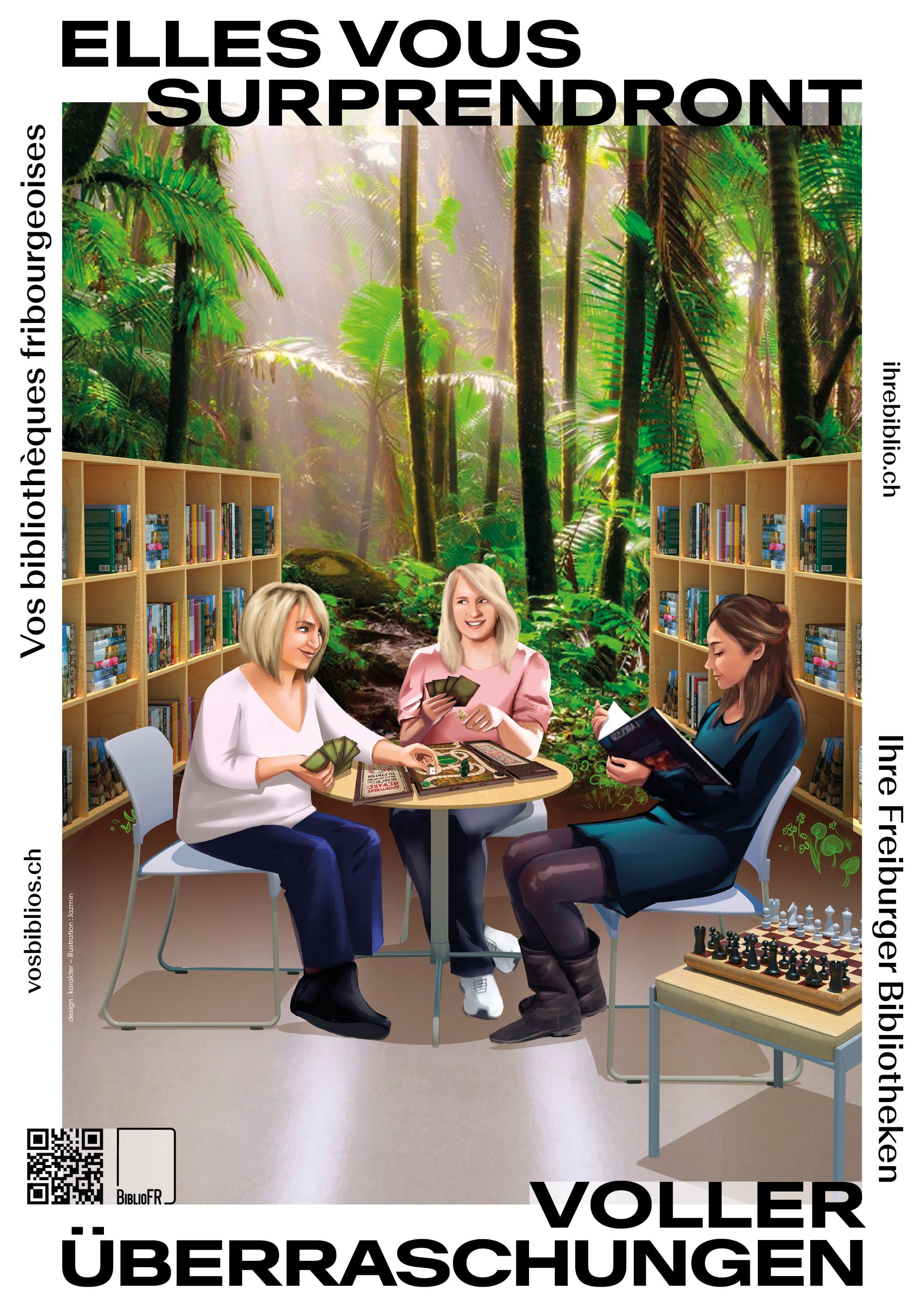 Die Kampagne wollte darauf aufmerksam machen, dass Bibliotheken Orte sind, die überraschen. Bunte Plakate luden dazu ein, von imaginären Räumen zu träumen – einem Dschungel, einem Labor und einem Weltraum. Auf der Website ihre-biblio.ch wurde die Bevölkerung dazu eingeladen, die vielfältigen Dienstleistungen Freiburger Bibliotheken zu entdecken und an einem Wettbewerb mit zahlreichen Preisen teilzunehmen.