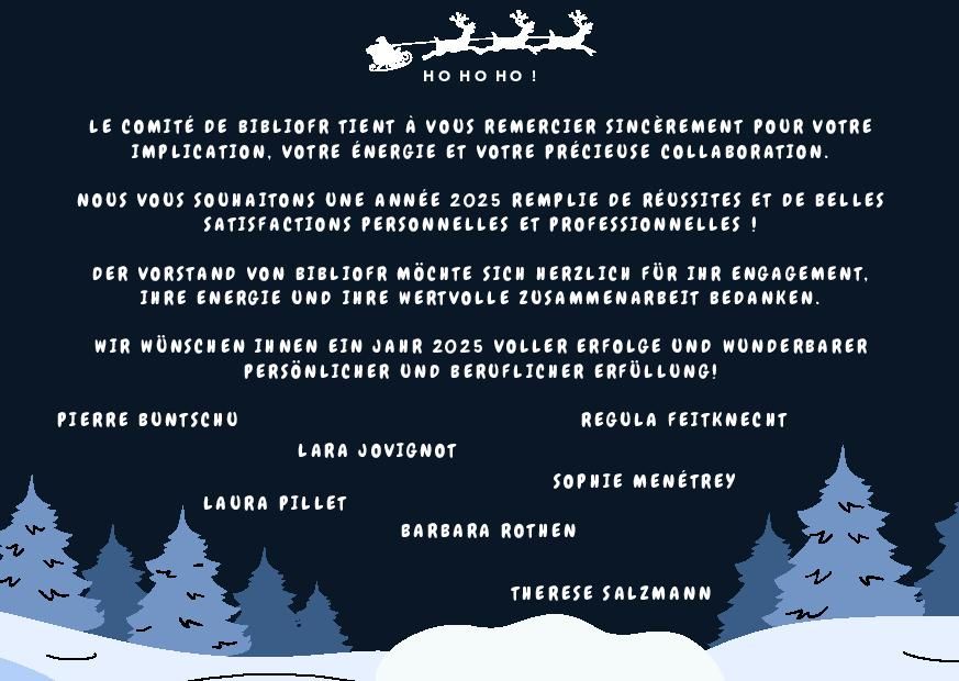 Der Vorstand BiblioFR dankt Ihnen für Ihre Mitarbeit und wünscht Ihnen Frohe Festtage !
